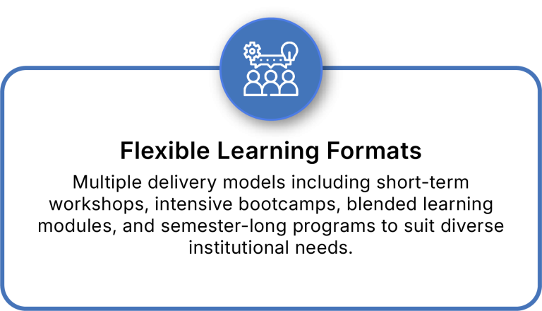 Multiple delivery models including short-term workshops, intensive bootcamps, blended learning modules, and semester-long programs to suit diverse institutional needs.